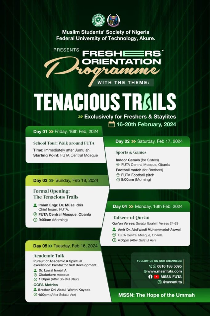 Fret not dear brethrens, MSSN FUTA has dedicated a whole week from Friday 16th to the Tuesday 20th February to give you the rudiments of how things run on this great campus